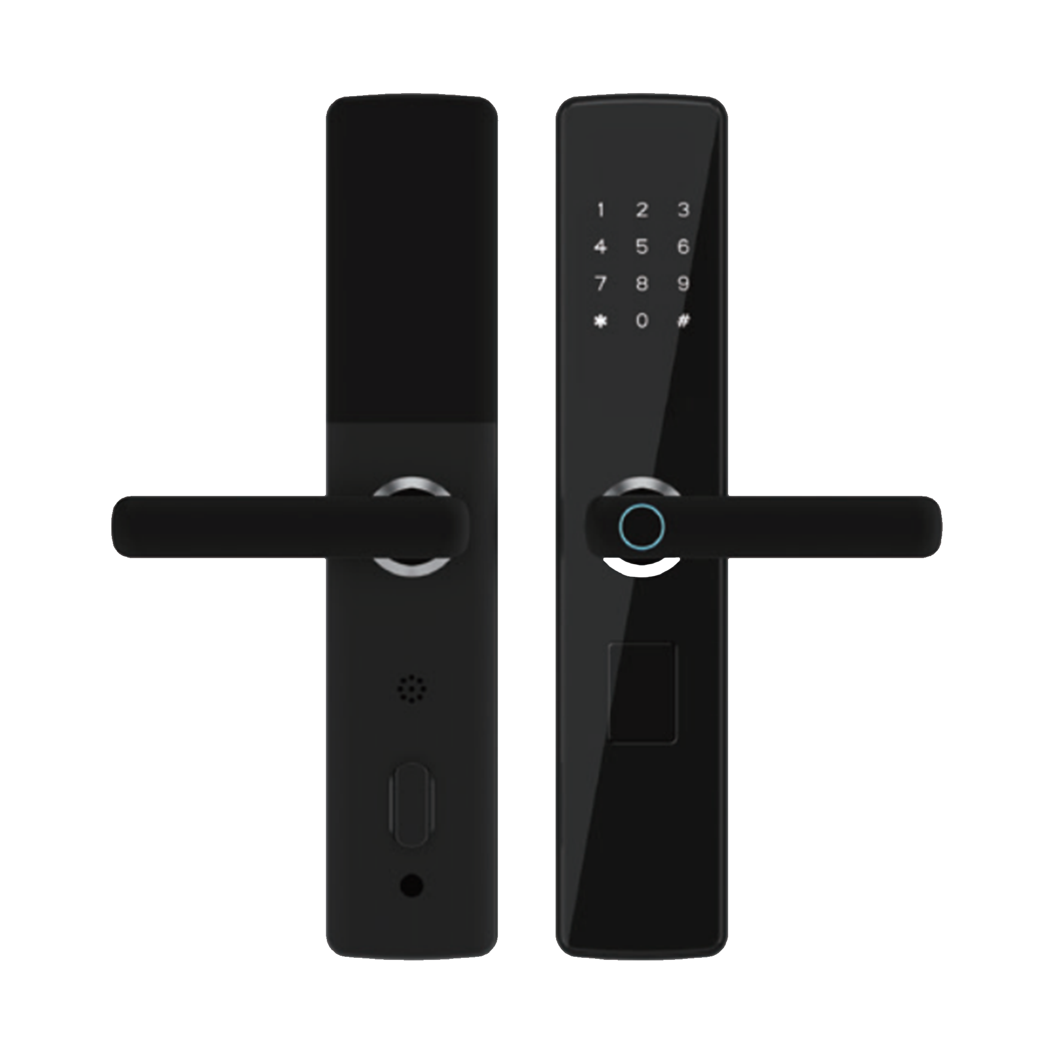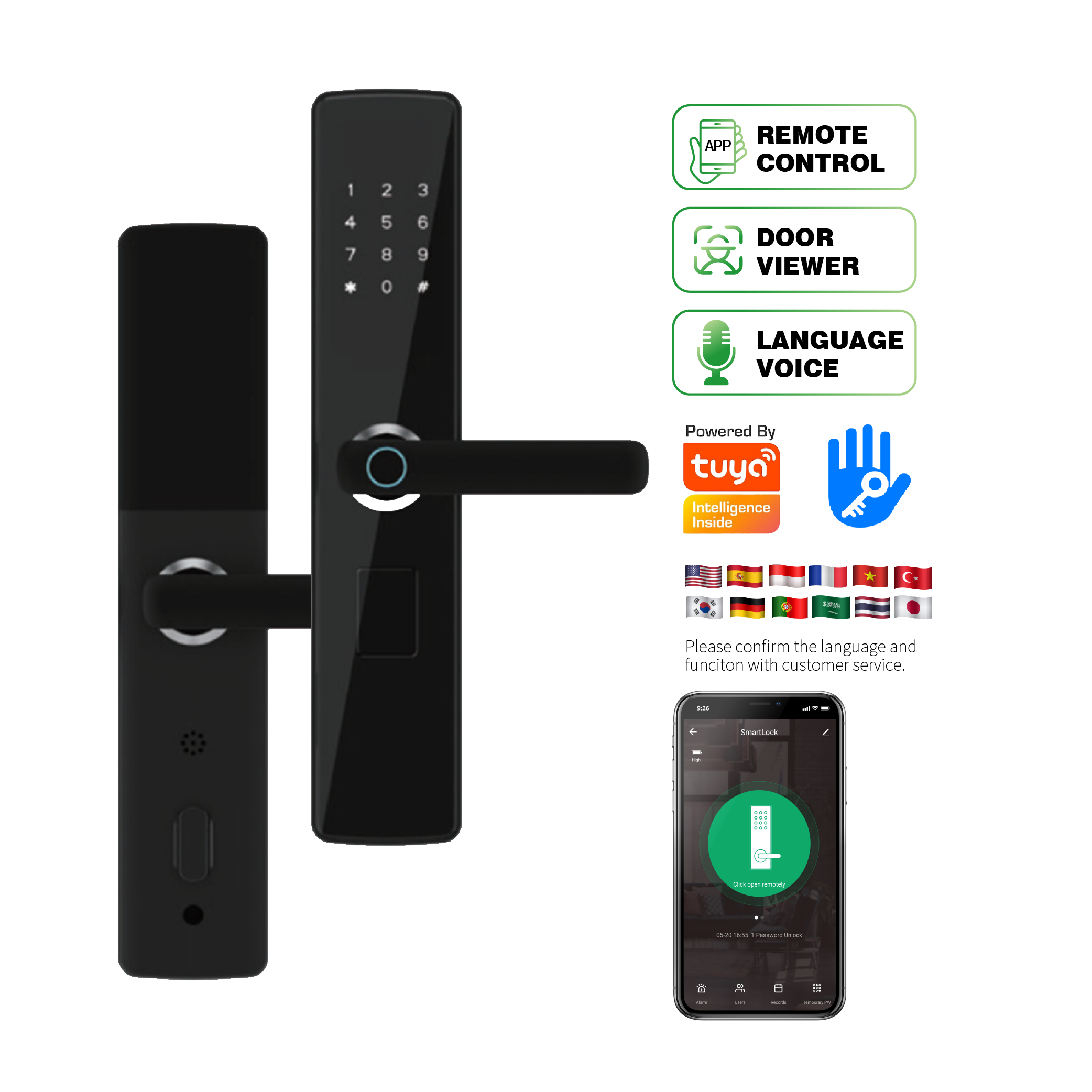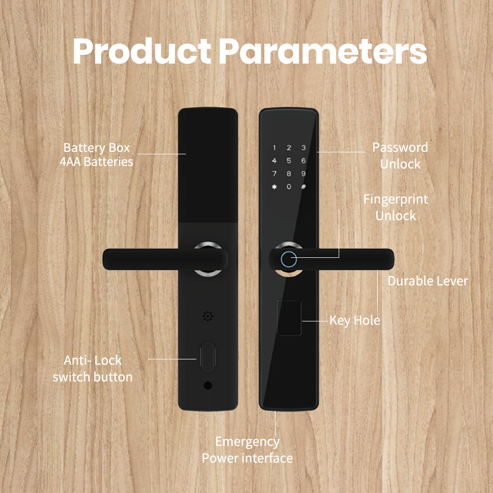 - Material: Aluminum alloy + tempered glass screen- Function: Fingerprint + password + card + NFC + APP + key-9 languages (English, Vietnamese, Portuguese, Arabic, Russian, Thai, Spanish, Indonesian, Chinese) - Power supply: 4pcs of 4AA(1.5V)Alkine Batteries- Fingerprint + password + card capacity: Total 300 pcs- Door thickness: 38-120mm- Mortise: 6068-...